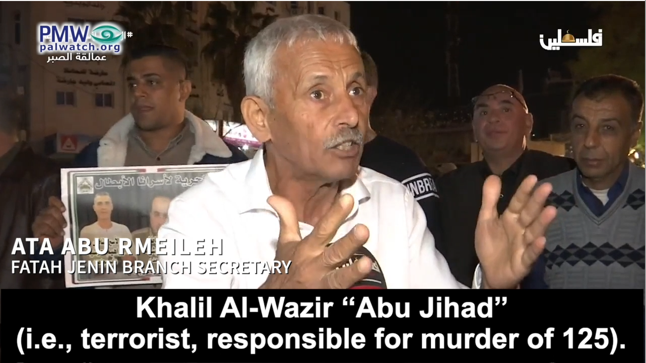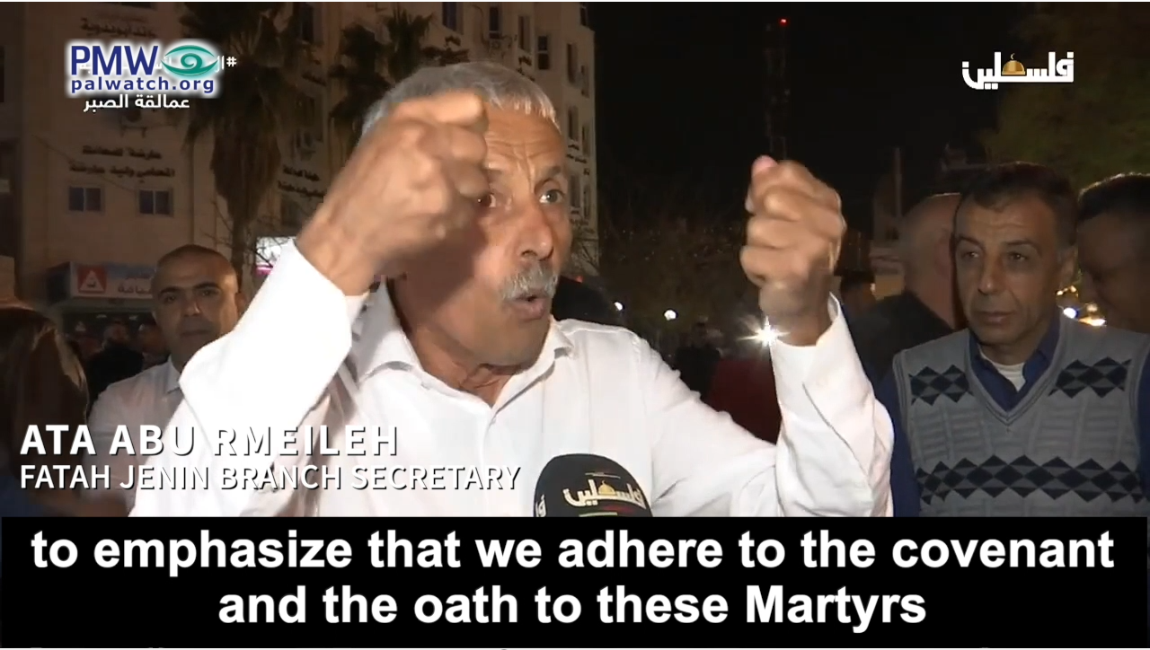 Fatah Secretary in Jenin Ata Abu Rmeileh counted these crimes as part of the “triumph over the occupation,” and stressed Fatah’s admiration for the murderers. He vowed that “we adhere to the covenant and the oath to these Martyrs” and to arch-terrorist Abu Jihad who was behind the murder of at least 125 Israelis: