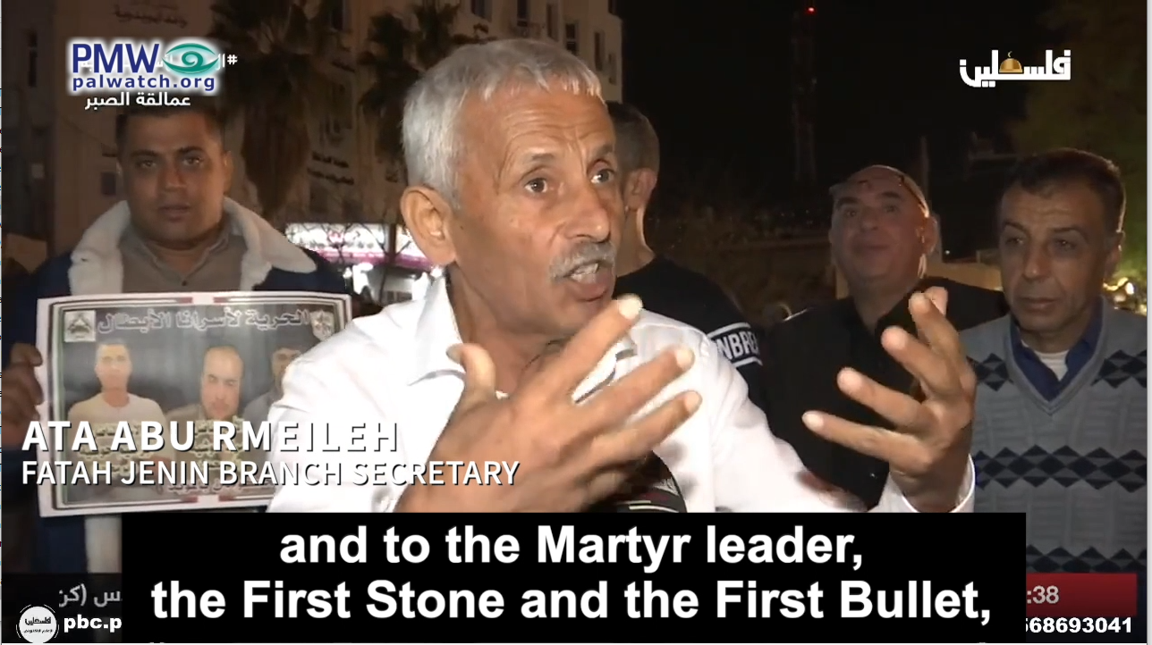 Fatah Secretary in Jenin Ata Abu Rmeileh: “The Jenin district is triumphing, triumphing over the occupation… As a sign of support for the blessed Al-Aqsa Mosque and the pure Martyrs and heroic Martyrs Ra’ad [Hazem], Diya [Hamarsheh] (i.e., terrorists who murdered 8), and all the Martyrs, today we light the torch of freedom and the torch of the prisoners to emphasize that we adhere to the covenant and the oath to these Martyrs and to the Martyr leader, the First Stone and the First Bullet, Khalil Al-Wazir ‘Abu Jihad’ (i.e., terrorist, responsible for murder of 125).”