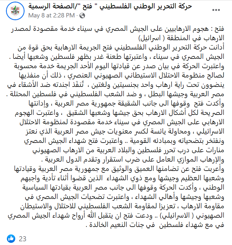 Posted text: “Fatah: The terrorists’ attack against the Egyptian army in the Sinai Peninsula (refers to Islamic State attack on May 7, 2022, in which 11 Egyptian soldiers were killed -Ed.) is a service for the source of terror in the region (Israel) [parentheses in source].