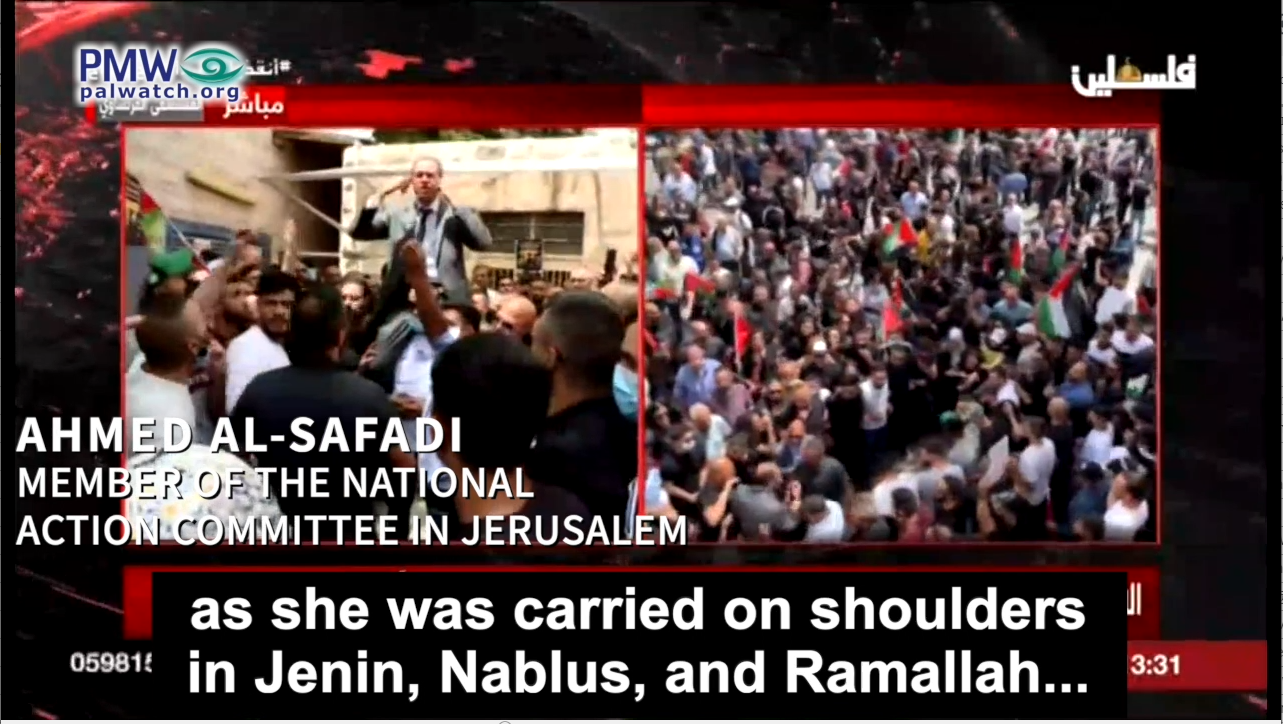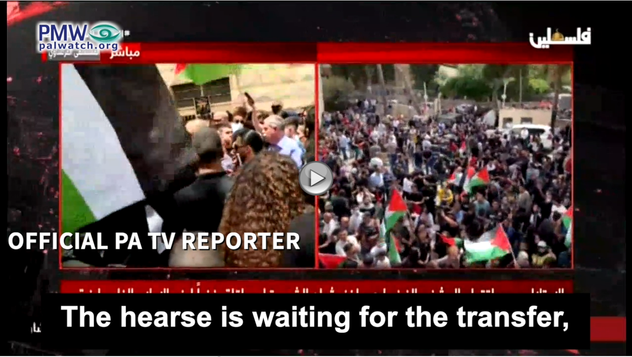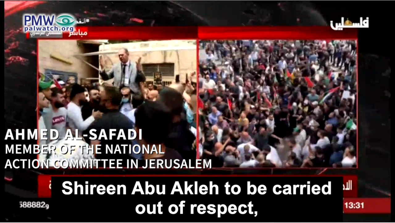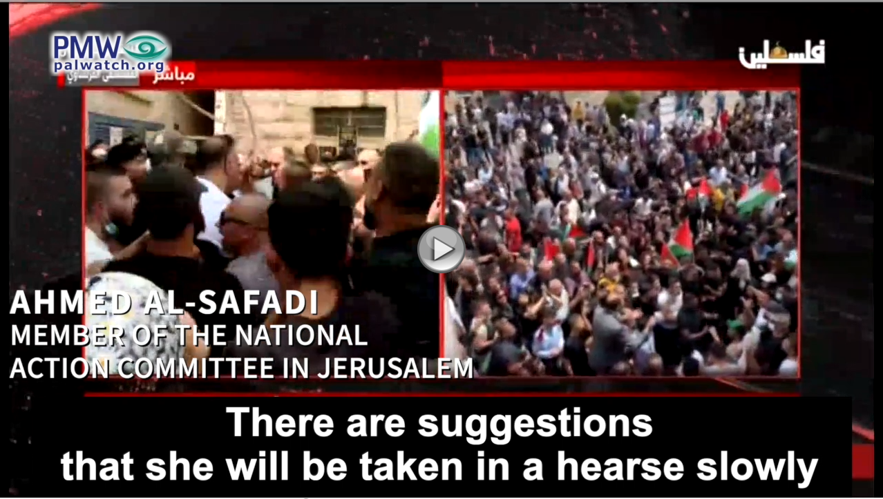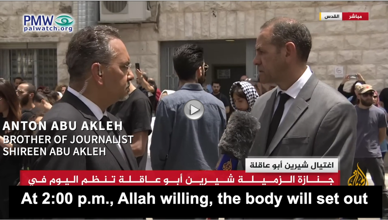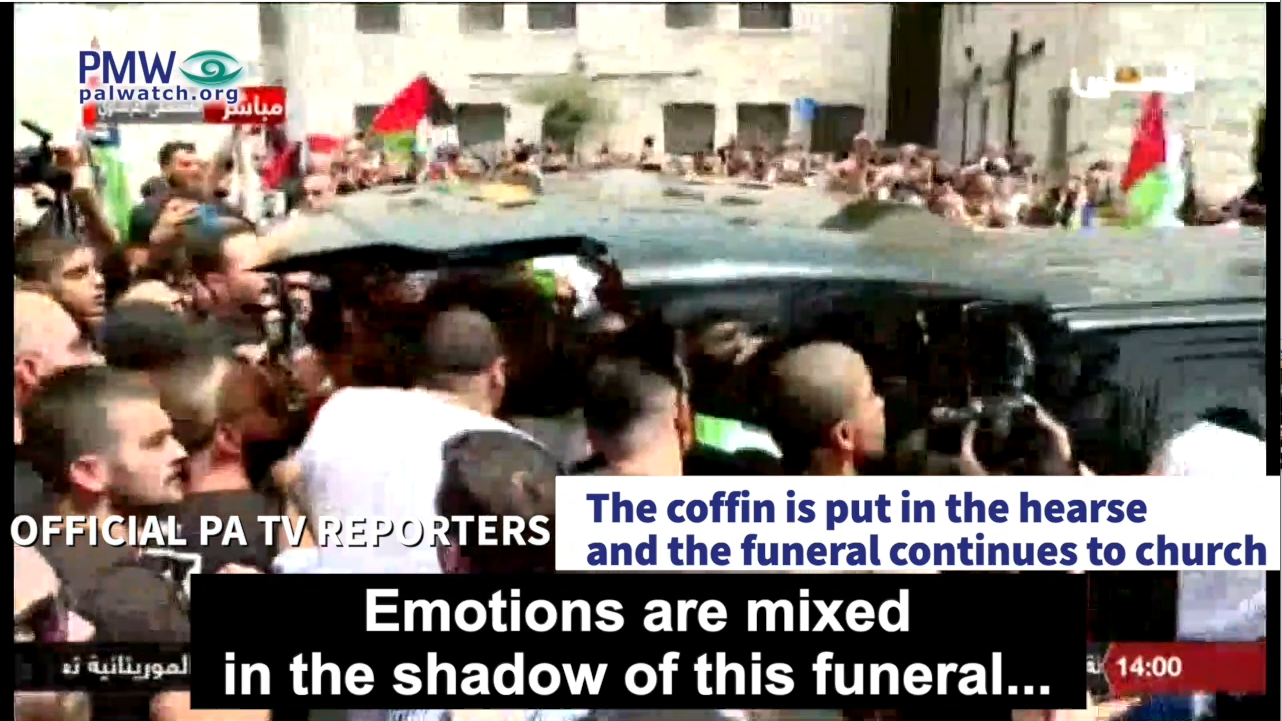 PMW has examined the broadcasts on official PA TV and Al-Jazeera prior to and during the funeral of Al-Jazeera journalist Shireen Abu Akleh, which confirms the Israeli version of the events that led to the violence. The videos of Israeli Police hitting some of those who carried the coffin on their shoulders were disseminated around the world to make it seem as if Israeli Police were interfering with the funeral. In fact, it was the exact opposite. It was a Palestinian mob that had hijacked the funeral and Israeli Police who were forced to intervene and have the funeral return to be held as the family planned.