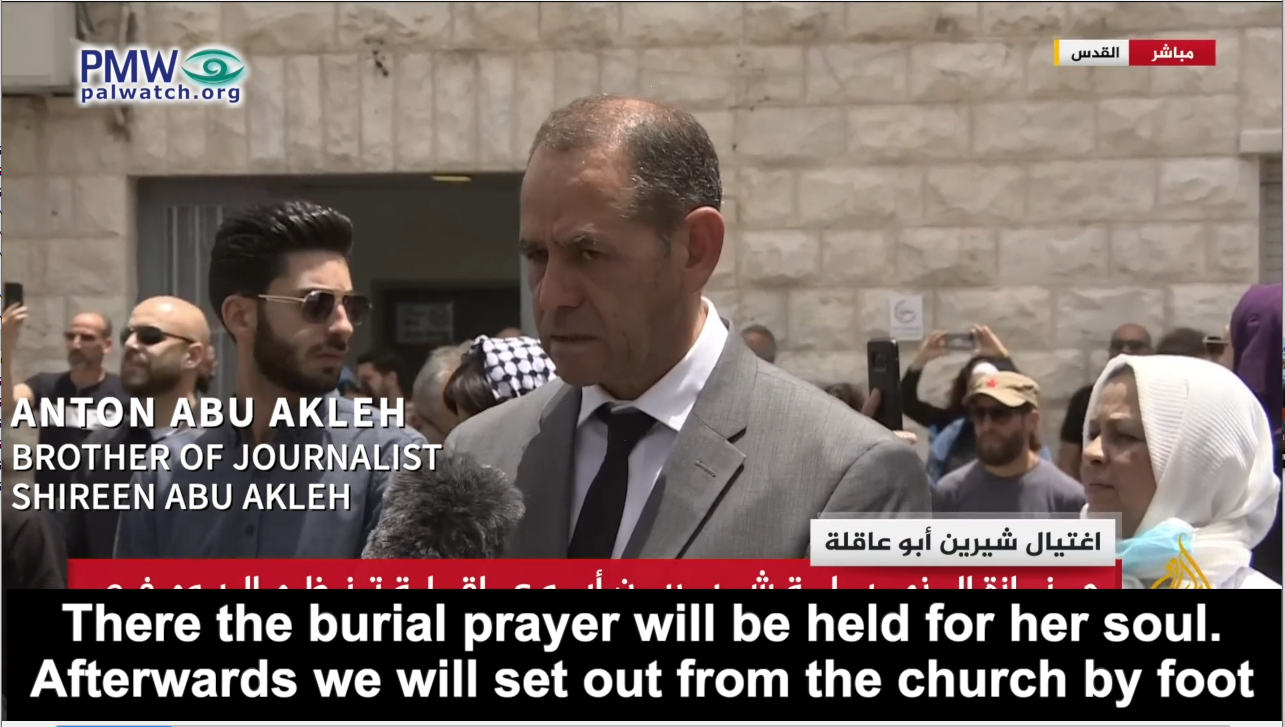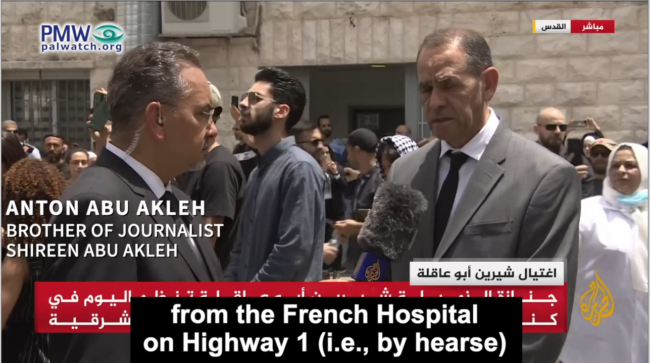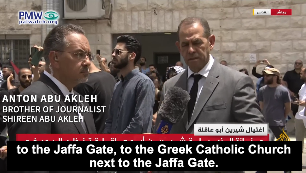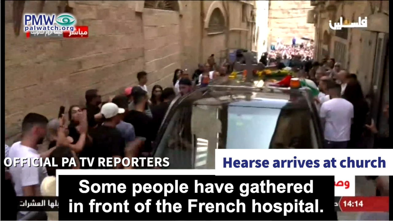 “At 2:00 p.m., Allah willing, the body will set out from the French Hospital on Highway 1 (i.e., by hearse) to the Jaffa Gate, to the Greek Catholic Church next to the Jaffa Gate. There the burial prayer will be held for her soul. Afterwards we will set out from the church by foot to the [Mount] Zion Cemetery of the Greek Catholic Church.”[YouTube channel of Al-Jazeera, May 13, 2022