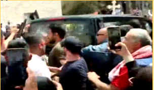 • 1:26 p.m.: The church’s hearse approaches the hospital to take Abu Akleh’s coffin, but the Palestinian mob, stops the car, bangs on its windows, and forces the hearse to leave without the coffin.