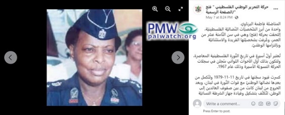 She broke her prison chains on Nov. 11, 1979 (sic., she was released in 1977) and immediately afterwards continued her national struggle with the revolutionary forces in Lebanon. After leaving Lebanon, she was among the ranks of those who returned to the homeland, in order to be appointed by Martyr, leader, symbol, and founder [former PLO Chairman and PA President] Yasser Arafat to shaping and leading the [PA] women’s police force.”