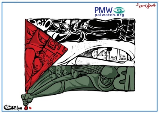 The cartoon shows the Palestinian flag with the various colored sections filled with images of people and fists. On the black section is written “the West Bank,” on the red section is written “the Gaza Strip,” on the white section is written “the diaspora,” and on the green section is written “the 1948 [territories]” – a PA term for Israel. In the center of the flag on the white section is written “Palestine” in English.