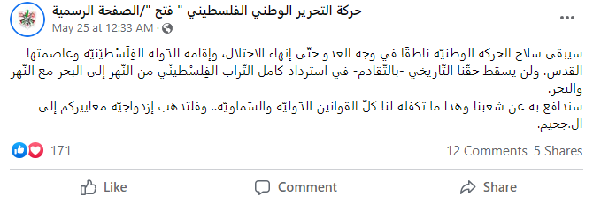 Posted text: “The national movement’s weapon will continue to speak against the enemy until the end of the occupation and the establishment of the Palestinian state whose capital is Jerusalem. No statute of limitations will apply to our historical right to take back all the Palestinian land from the [Jordan] River to the [Mediterranean] Sea, including the [Jordan] River and the [Mediterranean] Sea.We will defend our people with it (i.e., the weapon), and all the international and divine laws guarantee this. To hell with your double standards.”