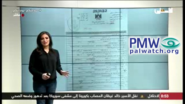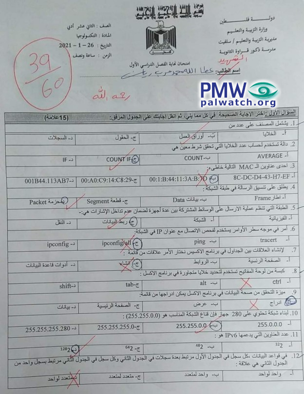 The screenshot shows the host presenting a picture of a graded test on which Atallah Rayyan received 39 out of 60; Rayyan received the grade just prior to his attack. The word “student” before Rayyan’s name has been crossed out and replaced with the word “Martyr.”