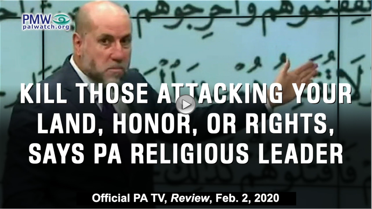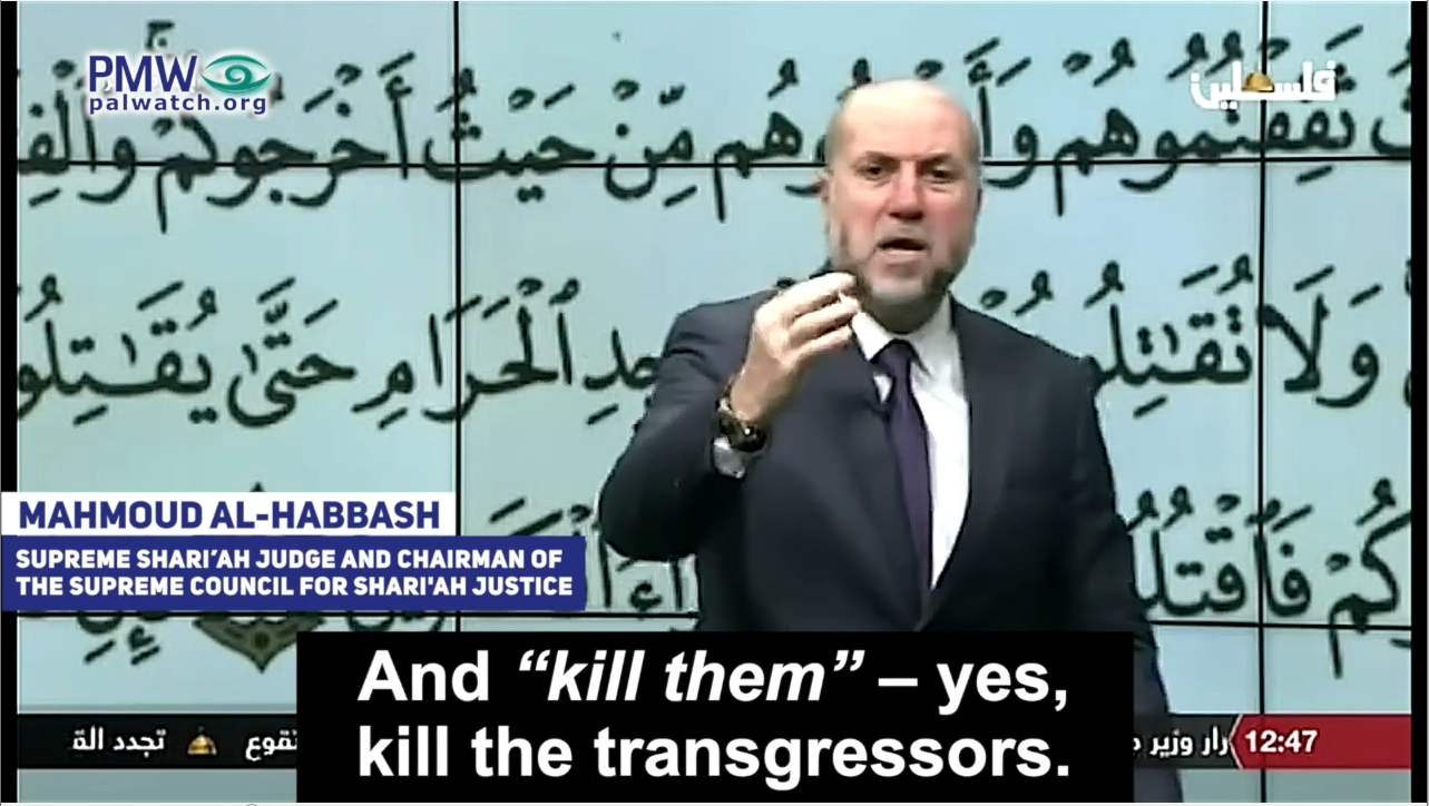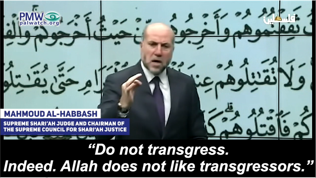 At other times Al-Habbash has been even more explicit, teaching on PA TV that the Quran commands fighting and permits killing Israelis – for crimes that he accuses Israelis of committing: Stealing Palestinian land, homeland, property and attacking your honor, your existence and more:
