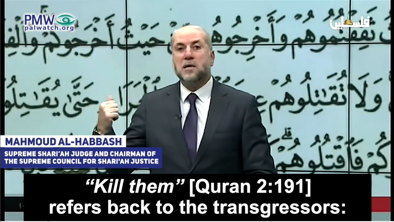 Al-Habbash: “Kill them” [Quran 2:191] refers back to the transgressors: “Do not transgress. Indeed. Allah does not like transgressors.” And “kill them” – yes, kill the transgressors. If someone comes to attack me ... my home... my land... my homeland... my property... my honor... my family... your existence... your rights... your souls… I am commanded to fight him. I am commanded to confront him, I am commanded to resist him, and I am allowed to kill him if necessary as Prophet [Muhammad] said and as this verse said: “And kill them wherever you find them.”