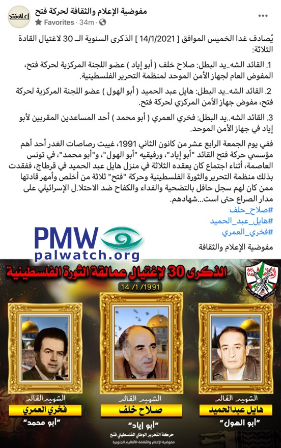 On Friday, Jan. 14, 1991, the treasonous bullets killed one of the most important founders of Fatah – commander Abu Iyad, and his two comrades – Abu Al-Hol and Abu Muhammad, in the [Tunisian] capital Tunis during a meeting the three held at the home of Hayel Abd Al-Hamid in Carthage.”