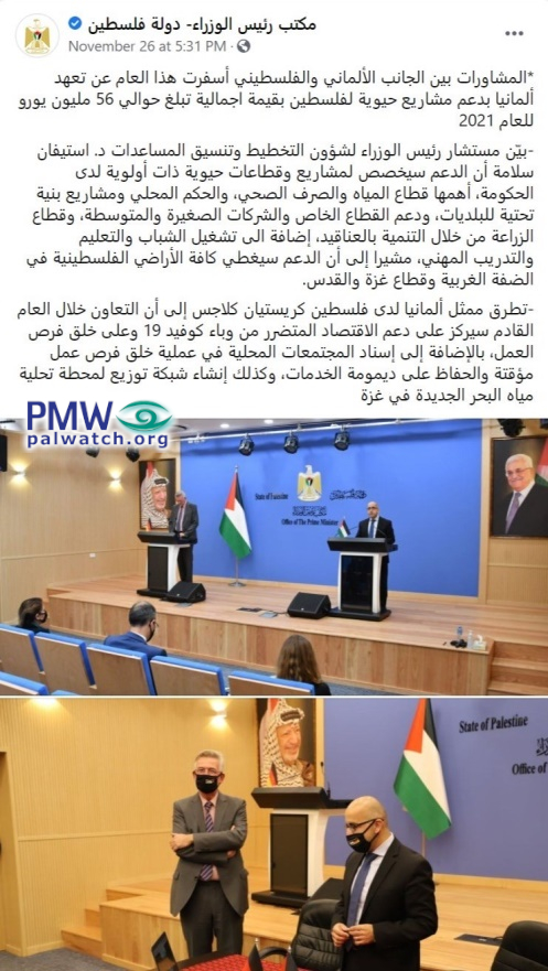 Posted text: “The conversations between the German and Palestinian sides have brought about Germany’s commitment to support essential projects of Palestine with a total worth approximately 56 million euros for 2021.