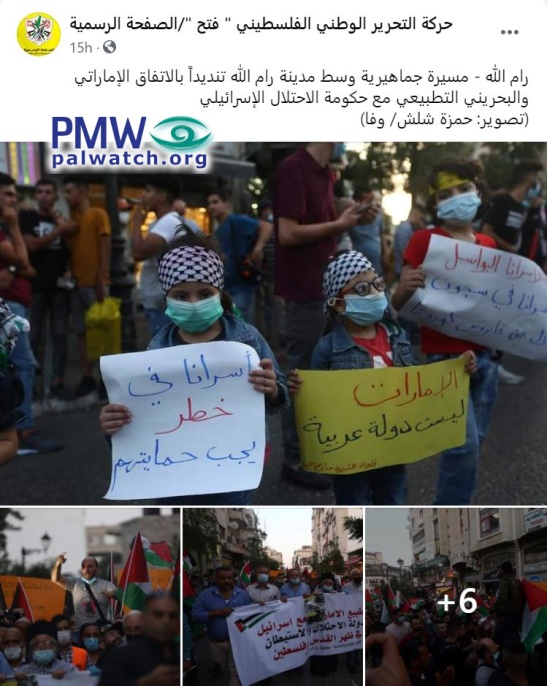 Posted text: “Ramallah – a mass procession in the center of Ramallah as a sign of condemnation of the UAE-Bahraini normalization agreement with the Israeli occupation government (see note below –Ed.)”