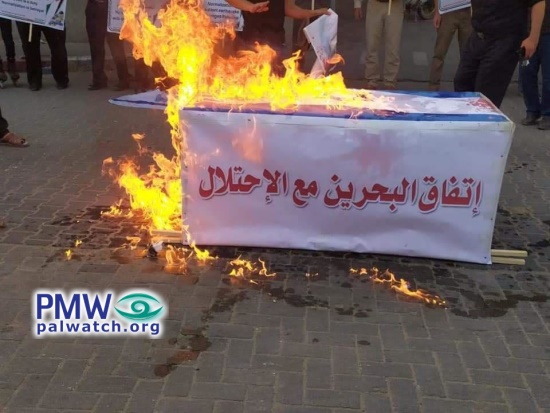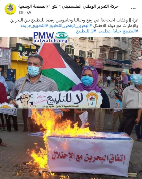 Posted text: “Gaza – protest rallies in Rafah, Jabaliya, and Khan Yunis [Gazan villages] in opposition to the normalization between Bahrain and the UAE with the occupation state [Israel] (see note below –Ed.).