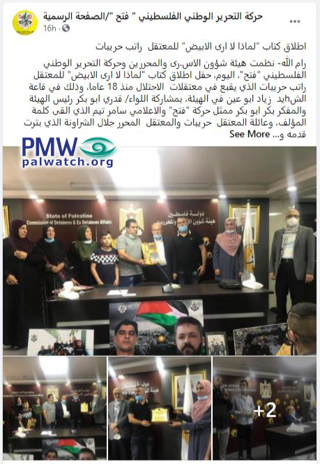 Posted text: “The launch of the book ‘Why Don’t I See White?’ by prisoner Rateb Al-Hreibat (PMW was unable to determine the details of his crimes –Ed.)