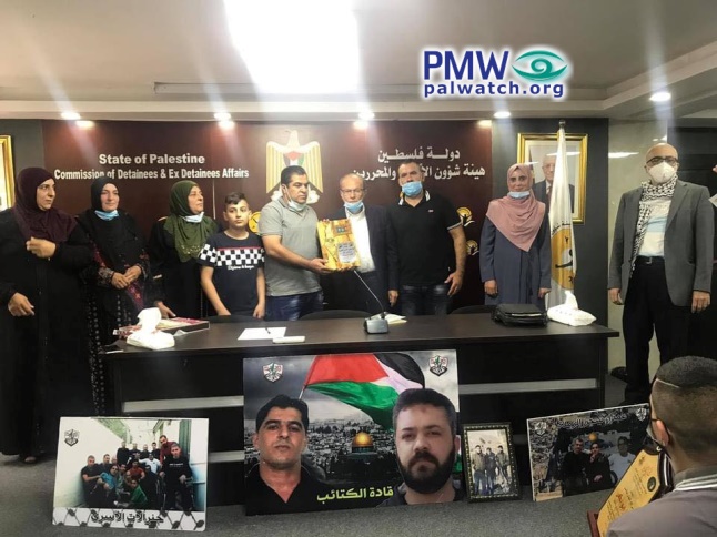 The image shows Director of PLO Commission of Prisoners’ Affairs Qadri Abu Bakr holding an honorary plaque featuring the PA map of “Palestine” that presents all of Israel (together with the PA areas) as “Palestine”.