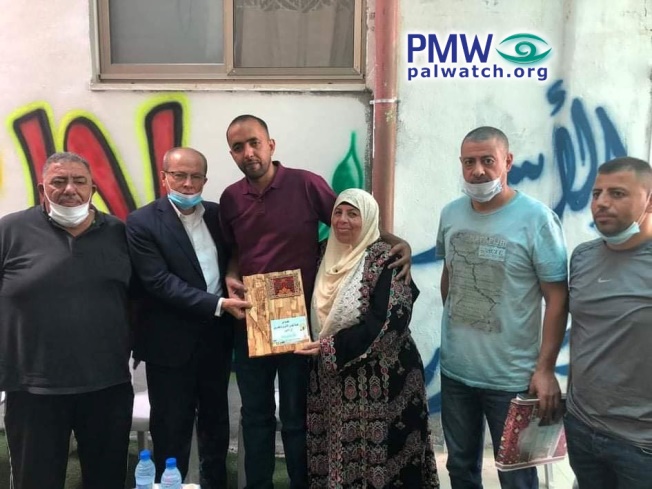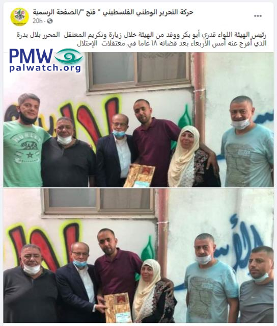Posted text: “Director of [PLO] Commission [of Prisoners’ Affairs] Qadri Abu Bakr and a delegation of the Commission, during a visit to, and honoring of released prisoner, Bilal Badra (PMW was unable to determine the nature of his crimes –Ed.) who was released yesterday, Wednesday [Sept. 23, 2020], after he served 18 years in the [Israeli] occupation’s prisons.”