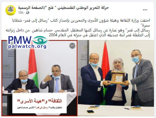 Posted text: “The [PA] Ministry of Culture and the [PLO] Commission of Prisoners and Released Prisoners’ Affairs celebrated the publication of the book ‘Letters to Qamar – Shards of Biography,’ which is a collection of letters written by Jerusalem resident and prisoner Husam Shahin (i.e., terrorist and member of the Al-Aqsa Martyrs' Brigades, serving 27 years) from his cell to the young girl Qamar, his friend’s daughter.”
