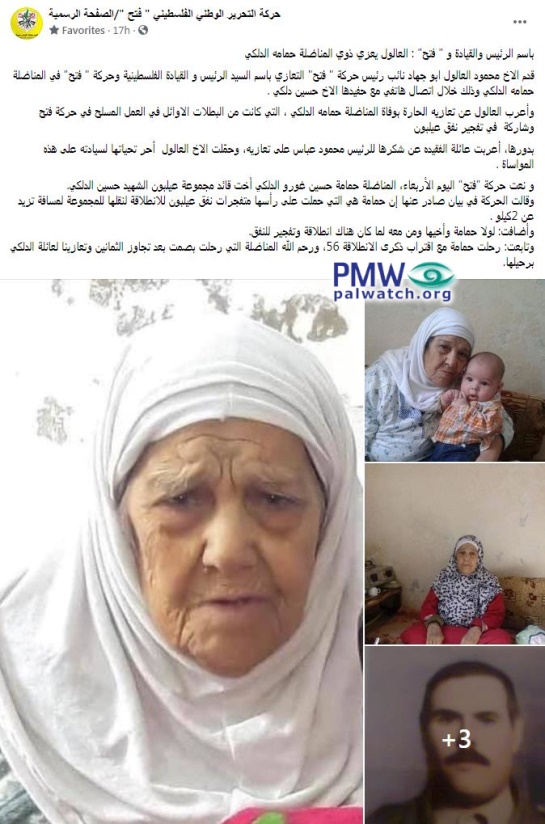 Posted text: “Fatah Movement Deputy Chairman [and Fatah Central Committee member] brother Mahmoud Al-Aloul ‘Abu Jihad’ expressed condolences on behalf of His Honor [PA] President [Mahmoud Abbas], the Palestinian leadership, and Fatah on the death of the female fighter Hamama Al-Dalki… who was among the first of the female heroes in Fatah’s armed activityand participated in the bombing of the Eilabun tunnel (i.e., attempted bombing of Israel’s National Water Carrier)…