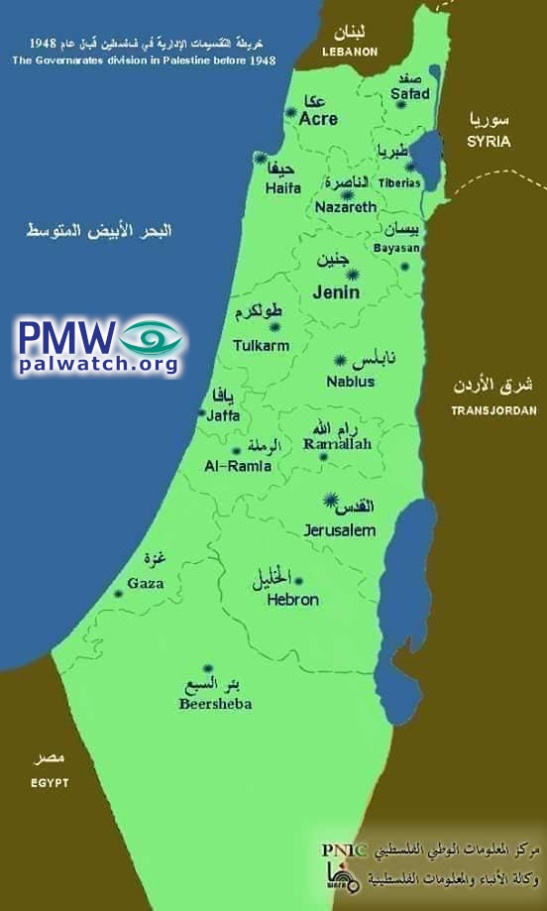 The image shows the PA map of “Palestine” that presents all of Israel (together with the PA areas) as “Palestine”,, with various districts of Mandatory Palestine demarcated and labeled in Arabic and English.