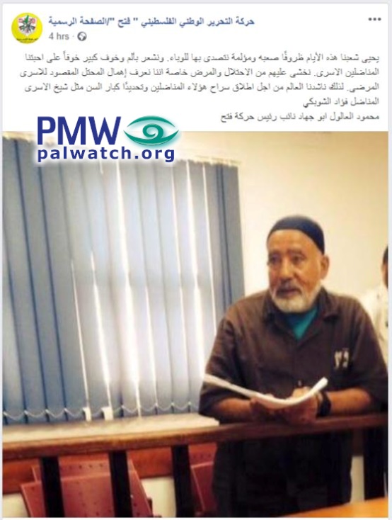 Posted text: “These days our people are experiencing difficult and painful conditions in which we face an epidemic (i.e., COVID-19 pandemic). We feel great pain and fear for our dear fighter prisoners. We fear for them because of the occupation and the diseases, and particularly because we are aware of the occupation’s deliberate neglect of the sick prisoners. Therefore, we call on the world to free these fighters, and particularly the elderly such as the oldest of the prisoners – fighter Fuad Al-Shubaki (i.e., senior PA official and weapons smuggler).