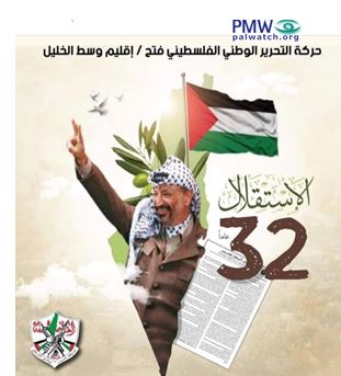 The image shows the PA map of “Palestine” that presents all of Israel, together with the PA areas, as “Palestine” , with former PLO and PA Chairman Yasser Arafat, an olive branch, and a Palestinian flag. To the right of the map is an image of the Palestinian declaration of independence – see note below. In the bottom left corner is the Fatah logo that includes a grenade, crossed rifles, and the PA map of “Palestine.”