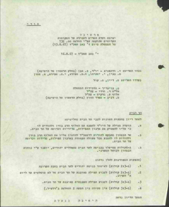 A meeting of the Israeli Ministerial Committee for Safeguarding of the Holy Places convened, on August 13, 1967, to discuss Rabbi Goren’s plans . The committee specifically rejected a suggestion to ban Jewish prayer on the Temple Mount, preferring to instruct the head of the committee to meet with Rabbi Goren and inform him that he should desist arranging prayers. A similar instruction was given to Minister of Defense Dayan to convey to Rabbi Goren through the IDF Chief of Staff. Interestingly the written summary of the decision made in the meeting is dated August 16, 1967. The original protocol of the decisions of the meeting and its translation appear below.