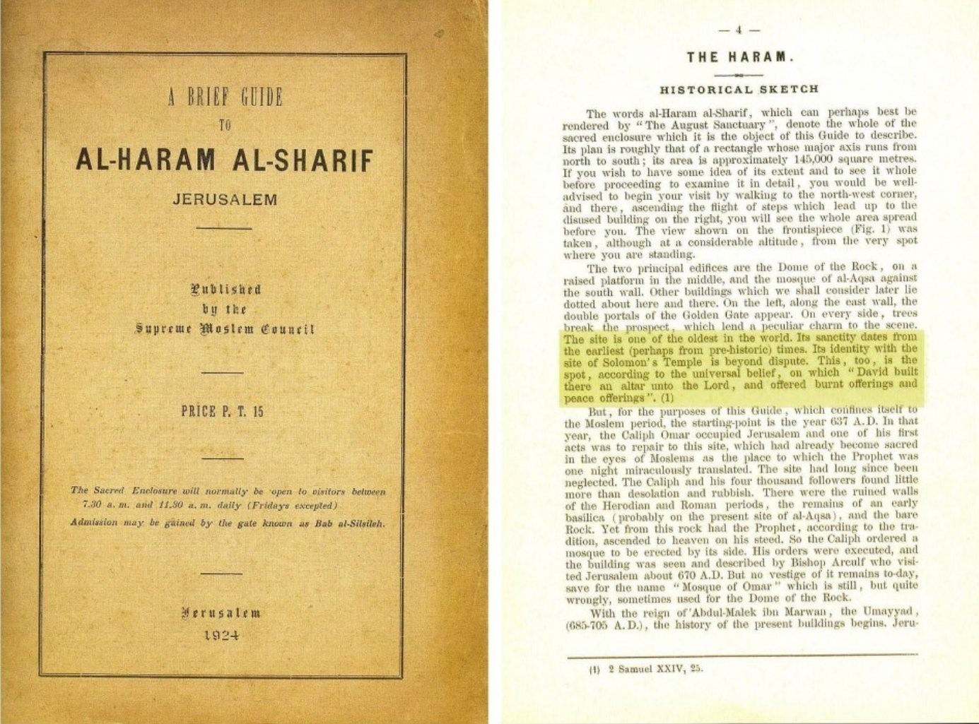 The Temple Mount is Judaism’s holiest site. It is the biblical Mount Moriah where Abraham was to sacrifice his son Isaac. It is the site at which King Solomon built the first Jewish Temple, destroyed in 586 BCE. It is the site at which the Jews, 70 years later, built the second Temple. As a pamphlet for tourists published in 1924 by the Supreme Muslim Council openly declares: “This site is one of the oldest in the world. Its sanctity dates from the earliest (perhaps from pre-historic) times. Its identity with the site of Solomon’s Temple is beyond dispute.”