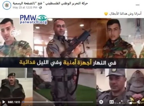 In the video linked to the post, Fatah glorifies 4 members of the PA Security Forces arrested or killed during gun battles with Israeli forces combatting terror. As well as glorifying the arrested and killed terrorists, the video further applauds the fugitive father of terrorist Ra’ad Hazem who murdered 3 in a terror attack in Tel Aviv. The father holds the rank of Colonel in the PA Security Forces.