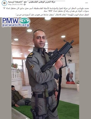 Posted text: “Muhammad Al-Tubasi, a hero of the Fatah Movement and the Palestinian [PA] security establishment, is a released prisoner who was imprisoned for 8 years. Two of his brothers are Martyrs, and he has a brother who was sentenced to 800 years (i.e., terrorist Said Al-Tubasi, who was responsible for the murder of 31 and the wounding of 93, is serving 31 life sentences). He was arrested this morning [May 24, 2022]. The occupation’s media ‘accuses’ him of the death of a Zionist officer a week ago in Jenin.”