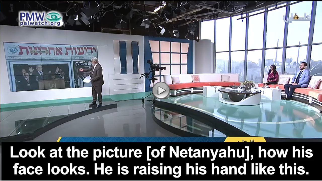 Fayez Abbas: “Look at the picture [of Netanyahu], how his face looks. He is raising his hand like this. He should have done it a bit like this, the Nazi salute, of Hitler. It is similar to it, just a little different. Because he is careful in these matters, he left [his hands] like this… Goebbels was the propaganda minister in the period of Nazi Germany, and apparently Netanyahu read Goebbels’ books and he is Goebbels’ outstanding student.”