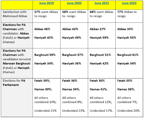 - In the June 2022 poll, if elections for the position of PA chairman were held the result would be a major win for Hamas with Ismail Haniyeh receiving 55% and Mahmoud Abbas only 33%. This result represents a major reversal and substantial rise in the popularity for Hamas. In 2019, Abbas would have defeated Haniyeh 48% – 42%.