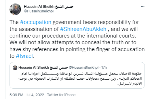 “We will not accept under any circumstances the manipulation of the outcomes of Palestinian investigations, and will continue the procedures on her assassination in international courts, particularly the International Criminal Court, since Israel is responsible for her killing and must bear the consequences.”
