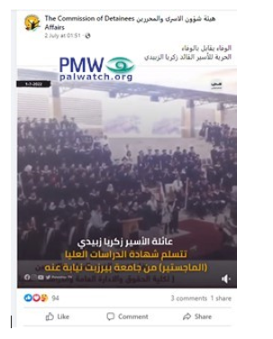 The PA-funded Commission of Prisoners’ Affairs also celebrated that Zubeidi received his degree with a special post on its Facebook page: