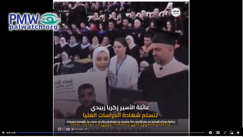 The occupation’s actions and violations against education in Palestine were present at the graduation ceremony, as the student daughter of prisoner Zakariya Zubeidi (i.e., Fatah terror leader responsible for numerous lethal attacks), who is imprisoned in the occupation’s [prison] cells, received her father’s master’s degree diploma in modern Arab studies.”