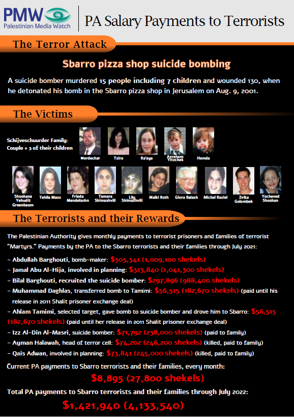 Blood money: The Palestinian Authority has already paid $1,421,940 to the terrorists who blew up the Sbarro pizza shop murdering 15 and injuring 130