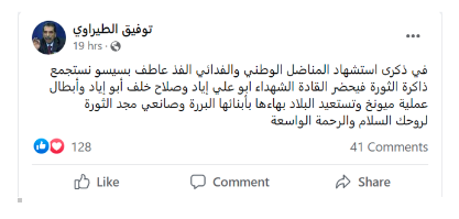 Posted text: “On the anniversary of the death as a Martyr of national fighter and exceptional self-sacrificing fighter Atef Bseiso (i.e., terrorist, involved in Munich Olympics massacre in which 11 were murdered), we will raise the memory of the revolution in our memories. Before us stand Martyr leaders Abu Ali Iyad (i.e., Fatah terror leader), Salah Khalaf ‘Abu Iyad’ (i.e., head of Black September terror organization), and the heroes of the Munich operation (i.e., Munich Olympics massacre). The land will take back its glory through its righteous sons who create the glory of the revolution. [May there be] great peace and mercy on your soul.”