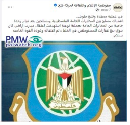As Palestinian Media Watch has already shown here, here, here, here and here (among other times), the arrest described in the above Fatah post is not an isolated event, but rather just one instance of an open and clear PA policy.