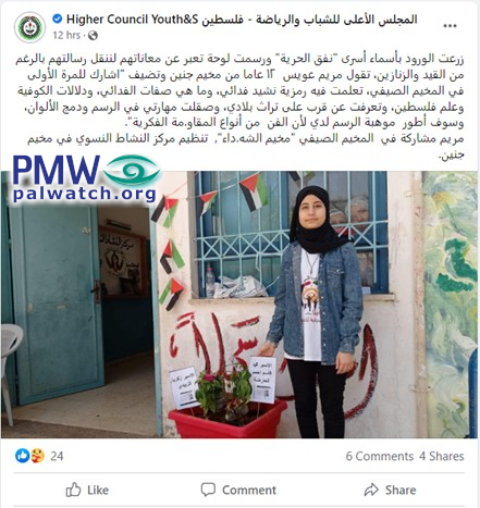 Posted text: “‘I planted roses with the names of “the freedom tunnel” prisoners (i.e., 6 terrorist prisoners who temporarily escaped Gilboa Prison; see note below) and made a painting that expresses their suffering so that we will convey their message in spite of the chains and the prison cells,’ says 12-year-old Maryam Aweis from the Jenin [refugee] camp, and adds, ‘I am participating in the summer camp for the first time, there I learned the symbolism of the [Palestinian] anthem Fida’i (i.e., “Self-Sacrificing Fighter,” see note below for full lyrics) and the traits of the self-sacrificing fighter, the meanings of the keffiyeh (Arab headdress) [and] the flag of Palestine, I got to know my people’s heritage from up close, I improved my skills in painting and combining colors, and I am going to develop my painting skills, because art is one of the types of ideological resistance.’ Maryam is participating in the ‘Martyrs’ Camp’ summer camp, which is organized by the Women’s Activism Center in the Jenin camp.”