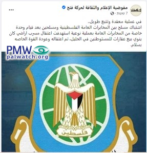 An armed confrontation [took place] between the Palestinian [PA] General Intelligence and armed men after a special unit of the General Intelligence carried out a quality operation whose goal was arresting a man who secretly transfers lands [to Israelis] and who intended to sell real estate to settlers in Hebron. He was arrested and the special force returned unharmed.”