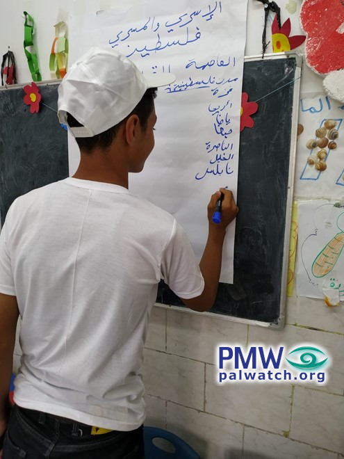 The image shows camp participants holding a drawing of the PA map of “Palestine” that presents all of Israel together with the PA areas as “Palestine” in the colors of the Palestinian flag. Next to the map is written “Palestine.” Other participants are holding a drawing of the Palestinian flag, and signs featuring the following names of cities, including Israeli cities: “Hebron,” “Jerusalem,” “Acre,” and “Be’er Sheva.”