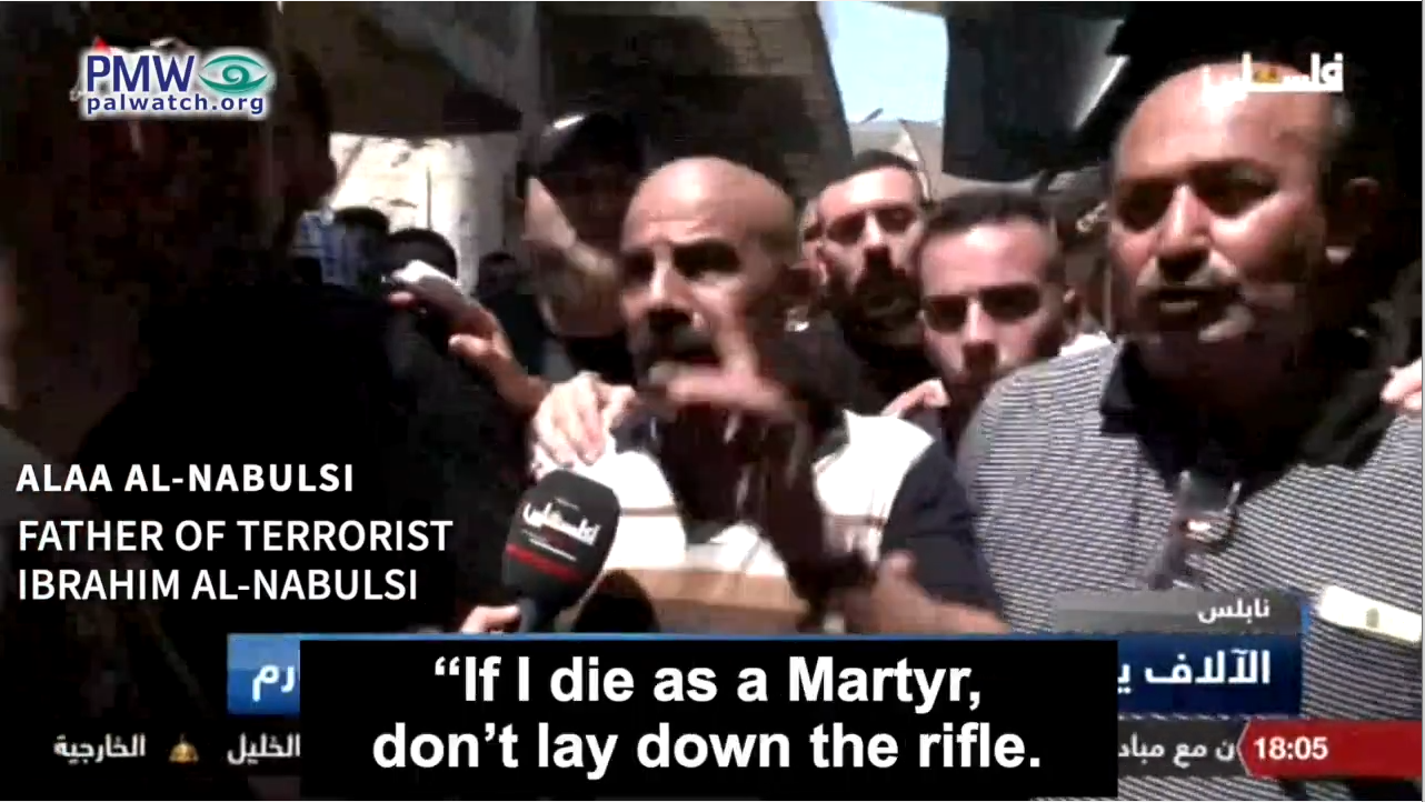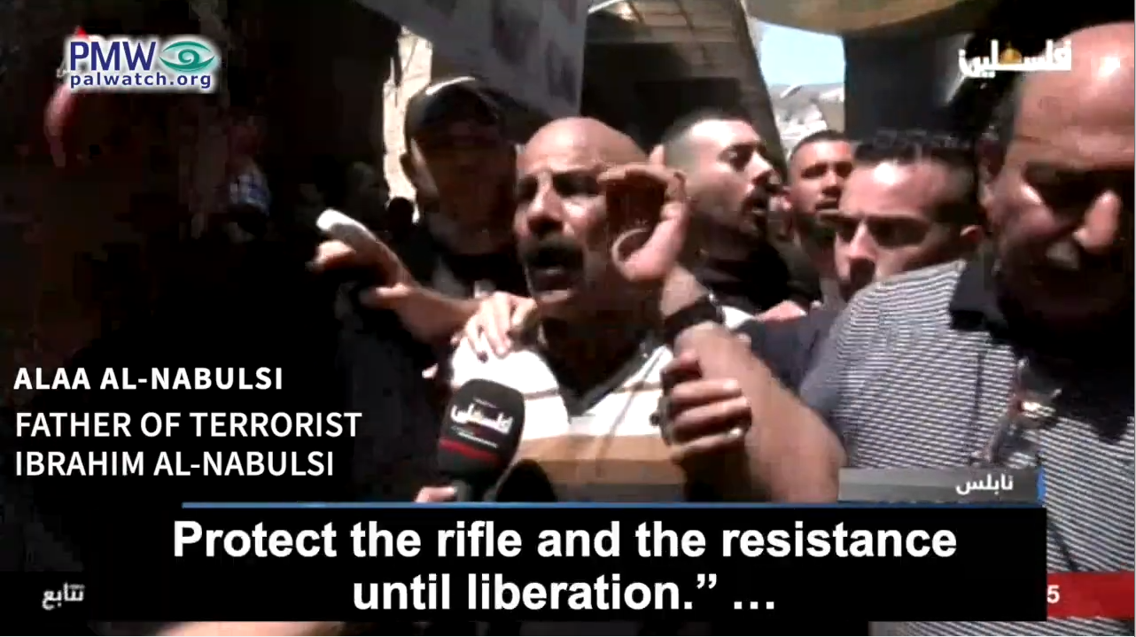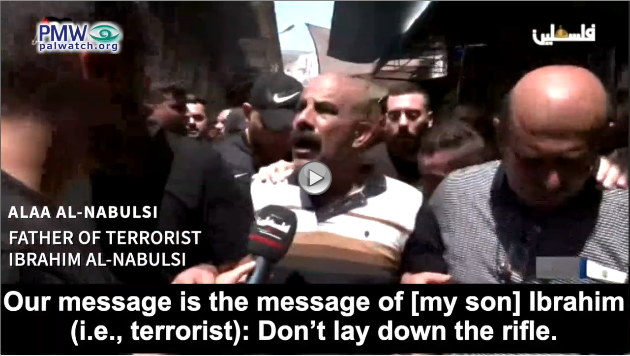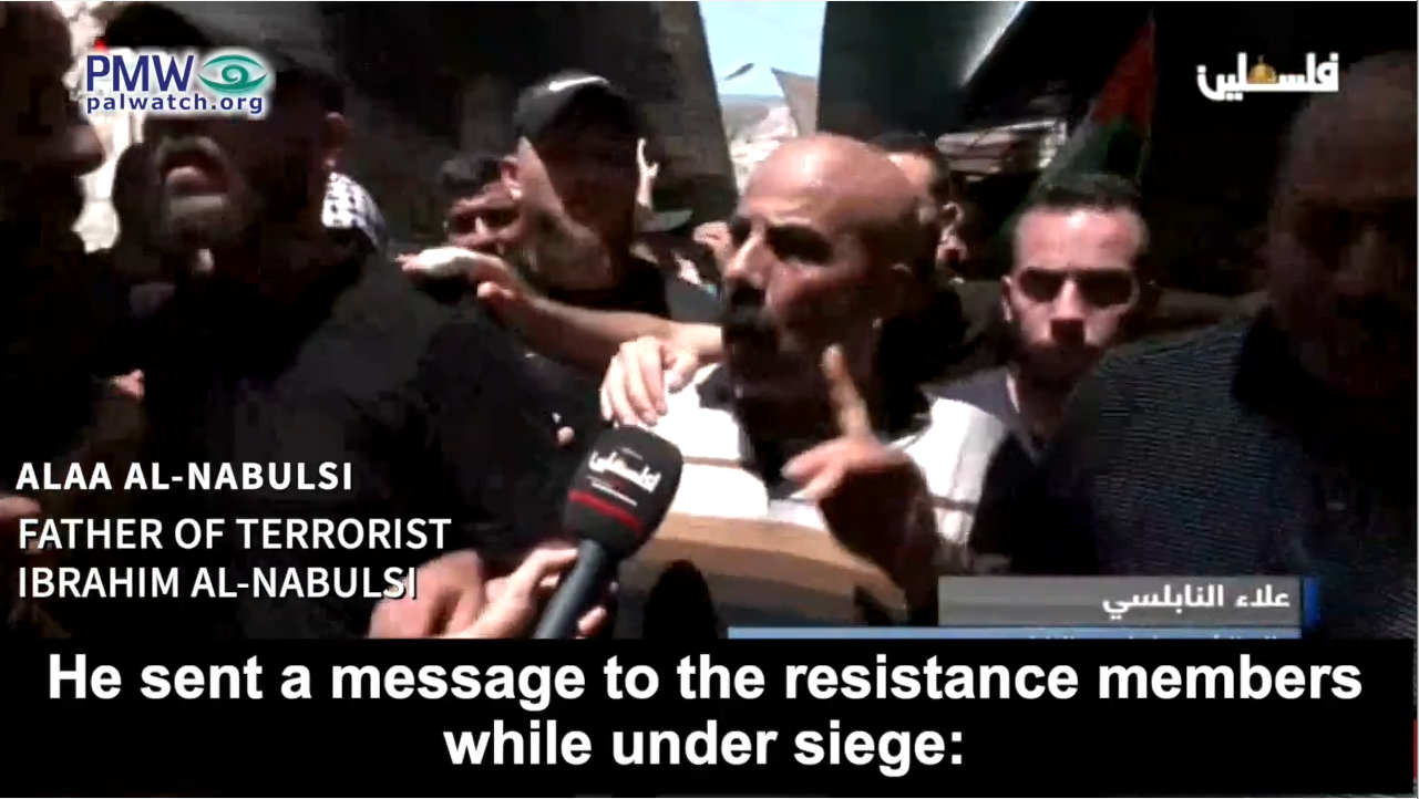 Alaa Al-Nabulsi, father of terrorist Ibrahim Al-Nabulsi: “Our message is the message of [my son] Ibrahim (i.e., terrorist): Don’t lay down the rifle. He sent a message to the resistance members while under siege: ‘If I die as a Martyr, don’t lay down the rifle. Protect the rifle and the resistance until liberation.’” …