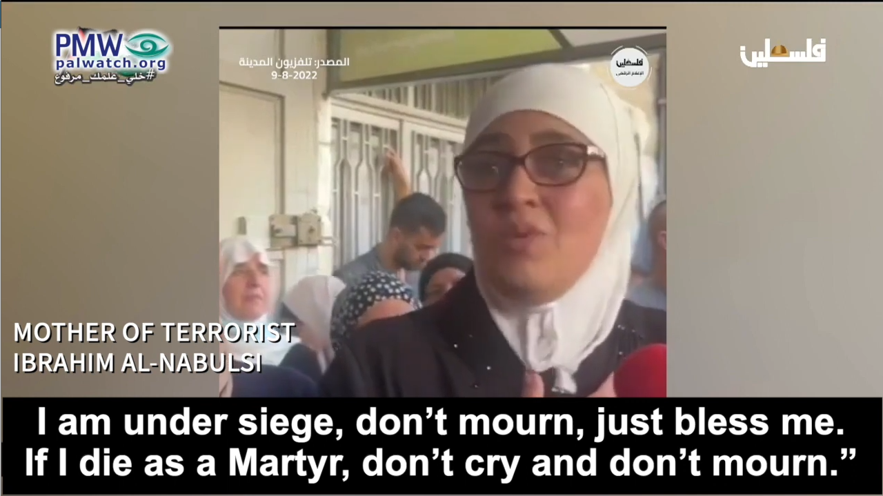 Mother of terrorist Ibrahim Al-Nabulsi: “[My son Ibrahim] told me: “Mom, don’t mourn for me. I am under siege, don’t mourn, just bless me. If I die as a Martyr, don’t cry and don’t mourn.” As for me, he is with the Master of the Universe, with Allah. The Master of the Universe gave him to me, and took him with His power and ability. He is a Martyr, praise Allah, a Martyr, a Martyr, praise Allah.”
