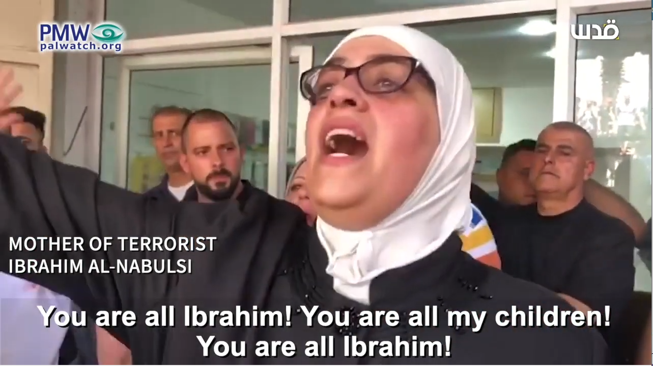 Mother of terrorist Ibrahim Al-Nabulsi: “They shot [my son] Ibrahim, but there are another 100 Ibrahims! Every one of you is Ibrahim! You are all Ibrahim! You are all my children! You are all Ibrahim! Ibrahim went to his beloved one. He went to his beloved one, Prophet Muhammad.”