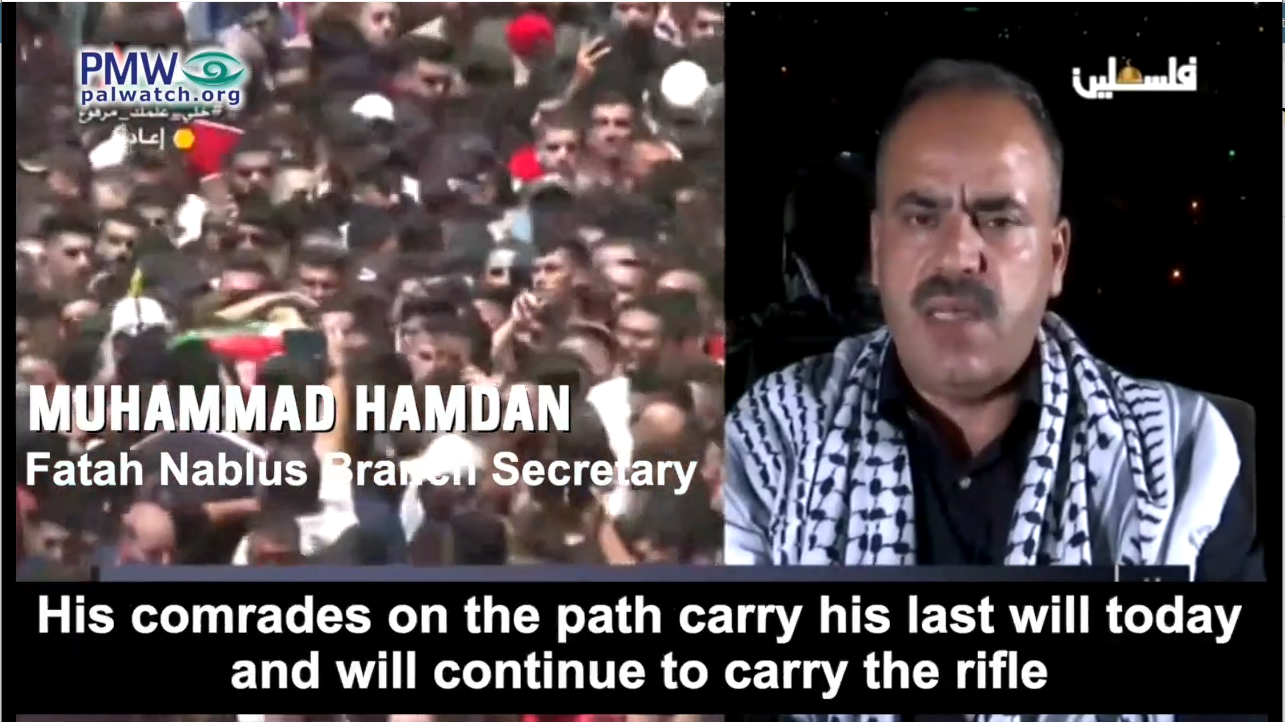 Official PA TV newsreader: “The [Palestinian] National Liberation Movement ‘Fatah’ eulogized its members Martyrs Ibrahim Al-Nabulsi (i.e., terrorist, responsible for numerous shooting attacks), Islam Sabbouh, and Hussein Taha who were shot by the occupation forces in the old city of Nablus and ascended to Heaven. Fatah said that it is nothing new to bid farewell to hero after hero, whom history will record their names in the book of our people’s eternal acts of glory, as our unarmed victim people is continuing a life of war, struggles, and suffering in dealing with the most despicable crimes in history that are continuing on our Palestinian land. We in Fatah are continuing our national resistance and confronting death with life and destruction with construction, while being firm in the national struggle. We are continuing the struggle and challenge despite every blow whose goal is to harm our determination. We will remain united with our people, holding onto our principles and our firm belief in the necessity of struggle that continues until victory and extricating freedom and independence.”
