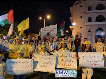 Children wearing yellow Fatah headbands and holding signs and Palestinian and yellow Fatah flags.