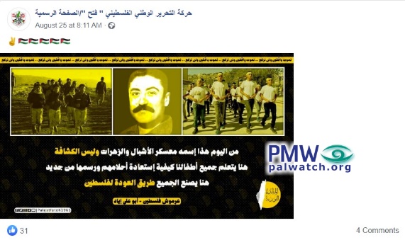 Text at bottom: “From this day its name is the Lion Cubs and Flowers camp (i.e., Fatah's Lion Cubs and Flowers children's movement) and not the scouts.