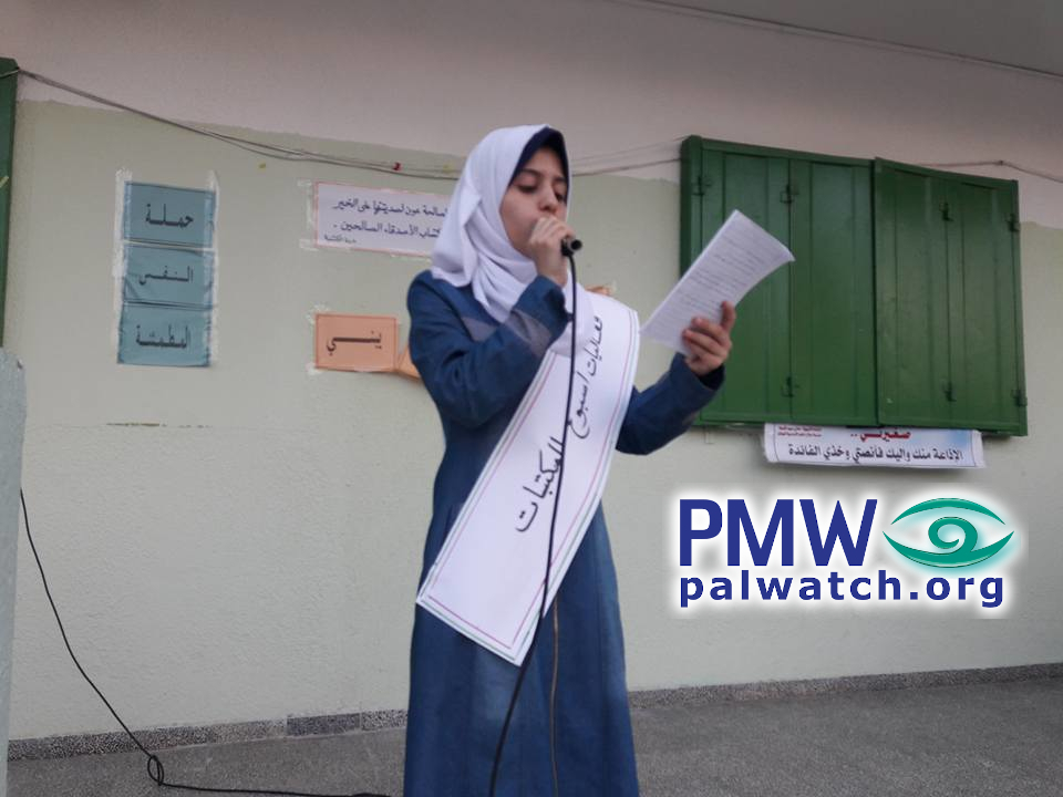 The picture shows a girl speaking at the Salah Khalaf Elementary School for Girls in Gaza.