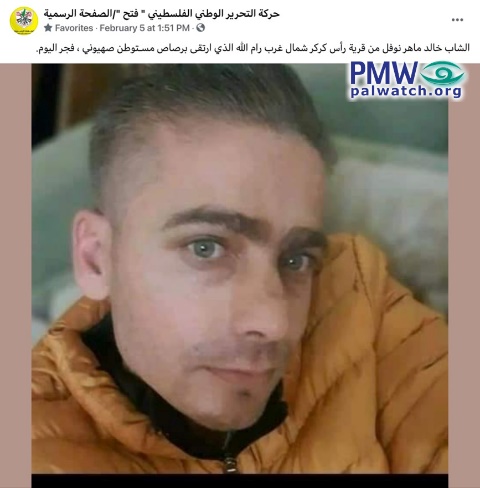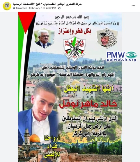 Posted text: “Young Khaled Maher Nawfal (i.e., terrorist and PA Ministry of Finance clerk, assaulted Israeli guard) from the village of Ras Karkar, northwest of Ramallah, who was shot and killed by a Zionist settler this morning.”