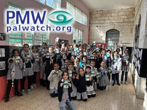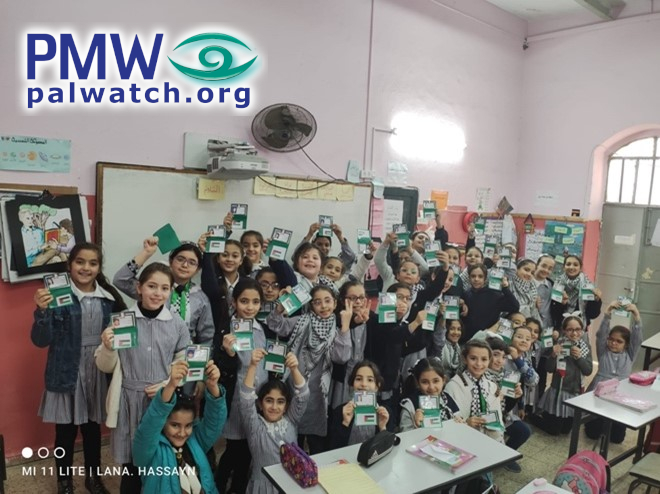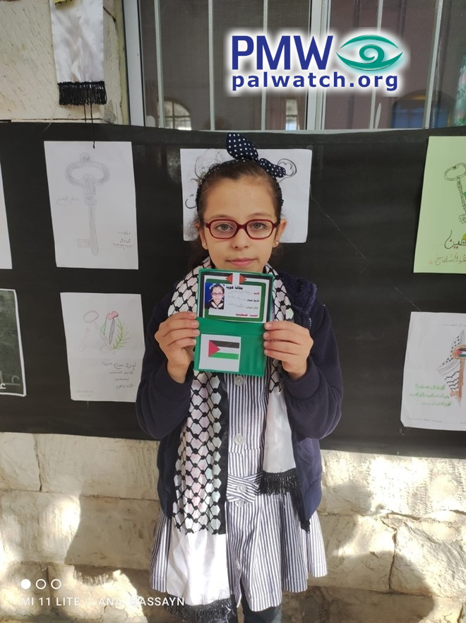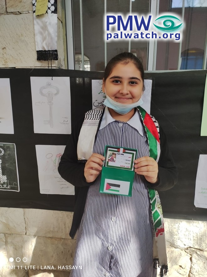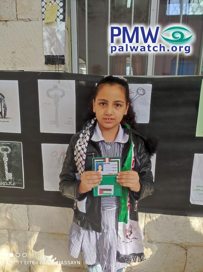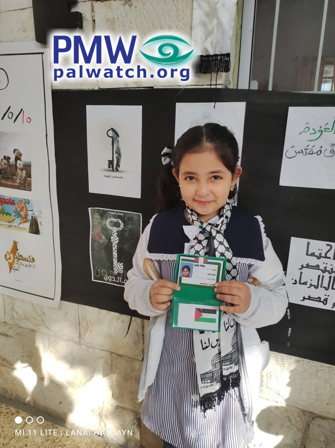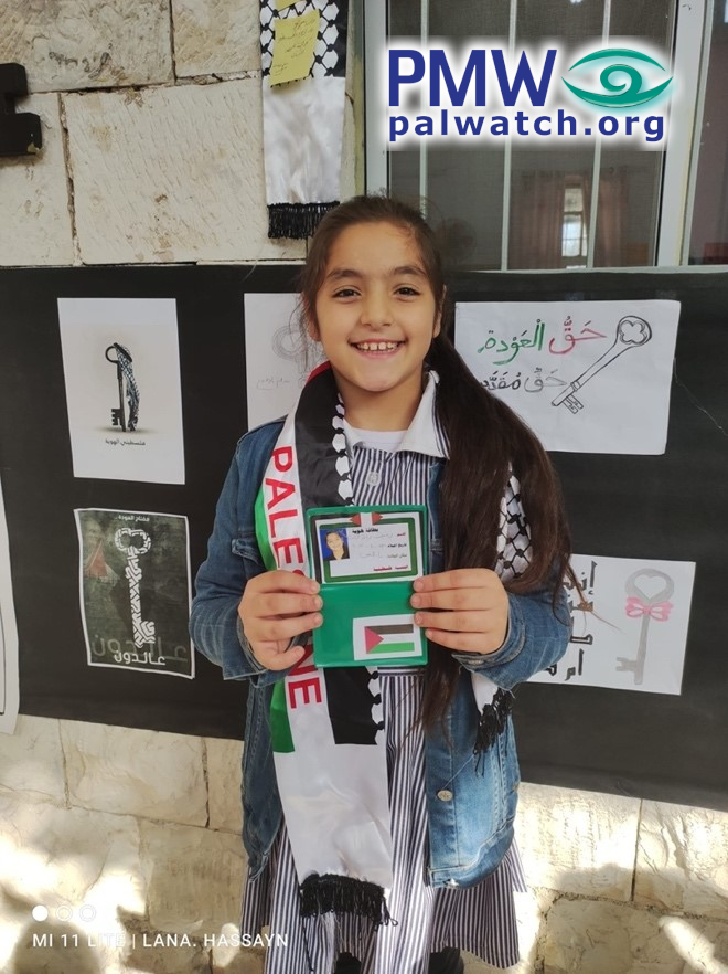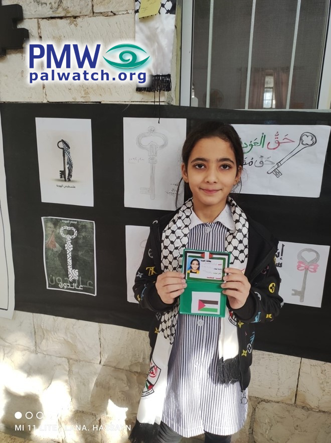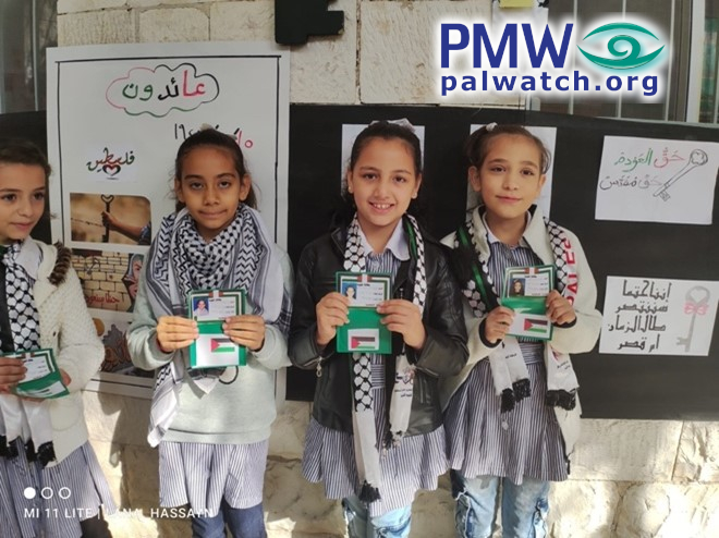 The images show female elementary school students holding dummy Palestinian identity cards with Palestinian flags on them. In the background are signs featuring keys symbolizing the Palestinian refugees’ “right of return.”