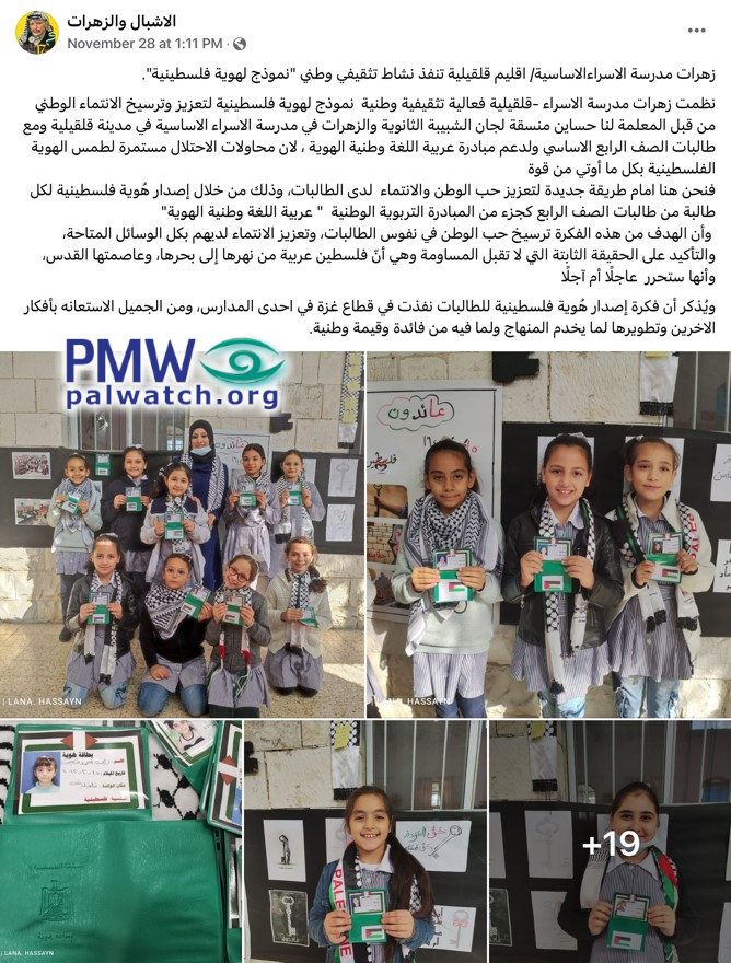 Posted text: “The flowers (i.e., young girls) of the Al-Israa Elementary School, Qalqilya branch, held a national educational activity: ‘dummy Palestinian identity cards.’