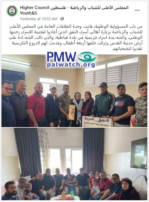 Posted text: “As part of the national responsibility, the [PLO] Supreme Council for Youth and Sports public relations unit held a visit to the families of the tunnel prisoners who restored the national momentum to the prisoners’ cause (refers to 6 terrorist prisoners who escaped from Gilboa Prison; see note below -Ed.), and also to the family of female Martyr Israa Khzaimiah (i.e., terrorist, attempted to stab Israeli security officers) in the village of Qabatiya who achieved Martyrdom-death on the land of Jerusalem and left behind four children. The unit gave them plaques of honor as a sign of appreciation for their sacrifice.”